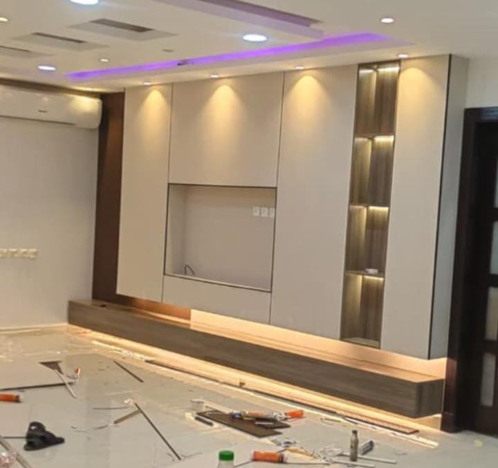 تصميم وتنفيذ ديكورات خلفيات شاشات تلفزيون بتصاميم عصرية وتشطيب أنيق يضيف لمسة فخامة للمجالس وغرف المعيشة.